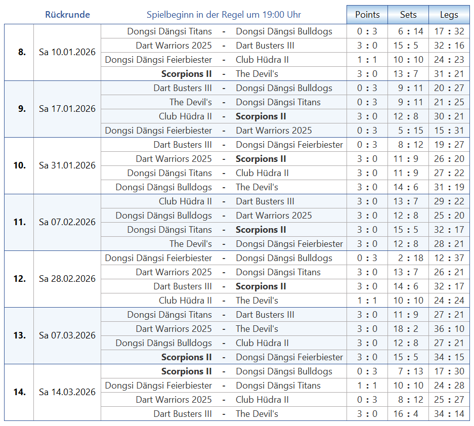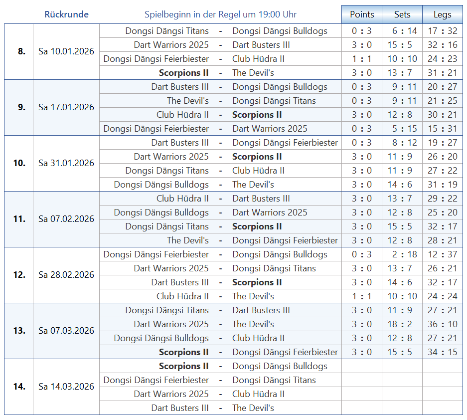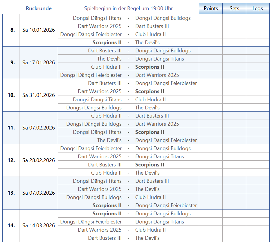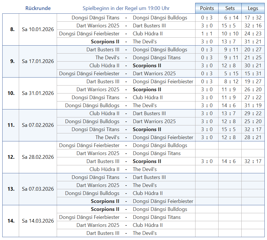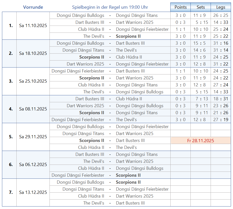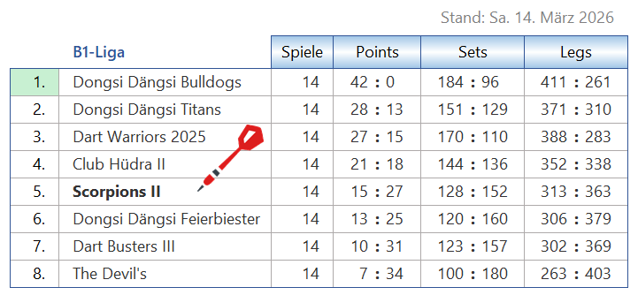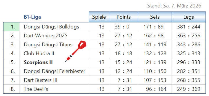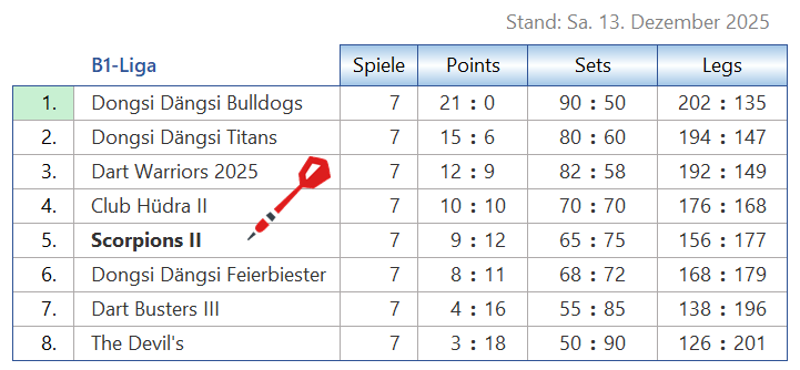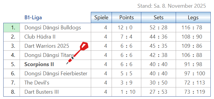 Tabelle & Co Scorpions [2] Seiten: 1 2 3 4 Saison 2025-2 B1-Liga Trikotansicht Spielorte Spieltagsimpressionen Leider wurden noch keine Spieltage dokumentiert. Seiten: 1 2 3 4
